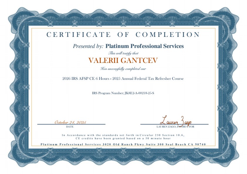 Я — бухгалтер и налоговый специалист (CTEC Registered Tax Preparer) с 23+ годами опыта. 20 лет — главный бухгалтер в России; последние годы — практика в США. Помогаю частным лицам и малому бизнесу: 1040/Sch C, QBO bookkeeping, payroll/1099, налоговое планирование и автоматизация. Работаю по регламенту, дважды проверяю цифры, соблюдаю сроки и конфиденциальность. Лос-Анджелес и все штаты.