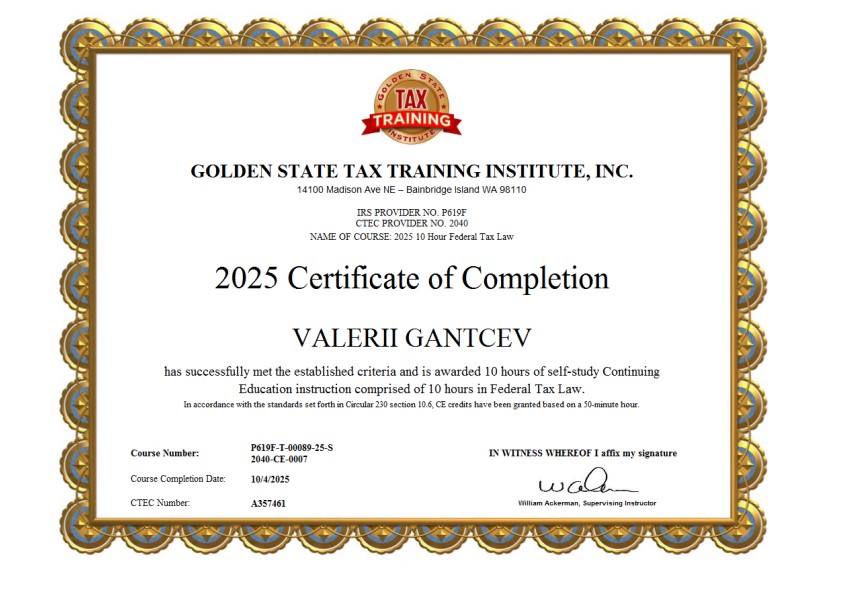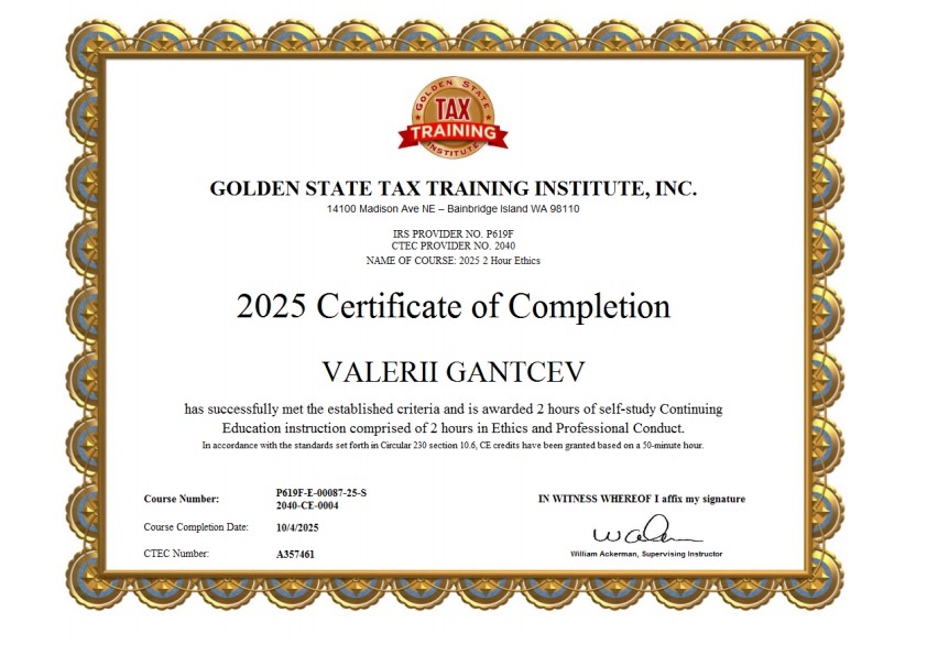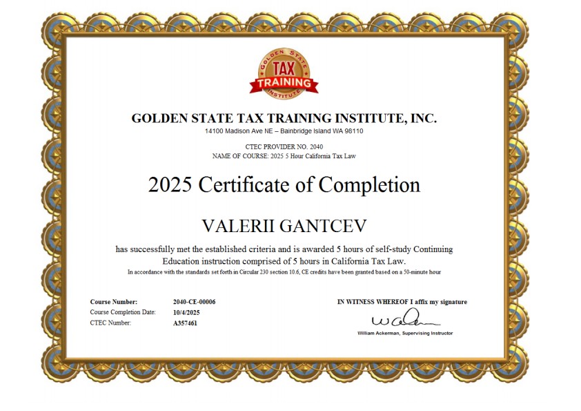 • Проверяемая квалификация: CTEC Registered Tax Preparer (CA).